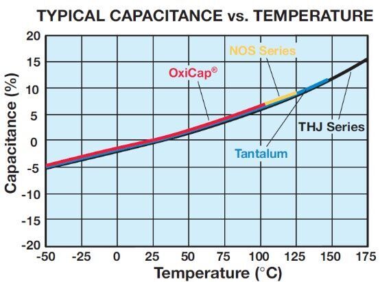 耗散系数随温度变化的典型曲线表演。这些地块是钽和OxiCap相同®电容器。对于最高限额,请参阅的评分表。